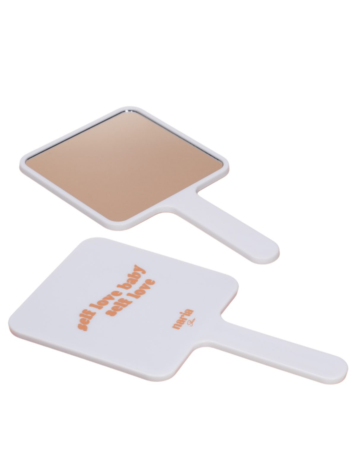 Λευκός καθρέφτης με τύπωμα στο πίσω μέρος “Self love baby, self love” και λογότυπο Naria Skin.